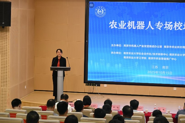 活动伊始,南京农业大学工学院党委书记崔春红与市机器人产业攻坚办负责人、市工信局装备工业一处处长唐娜等领导先后致辞。崔春红书记系统介绍了学校在农业机器人领域的科研积淀与创新成果,并阐述了推动科技成果转化、服务农业现代化发展的具体路径与决心。唐娜处长则在发言中充分肯定了校地协同对推动产业高质量发展的重要作用,为后续深化校地对接与合作奠定了坚实基础。