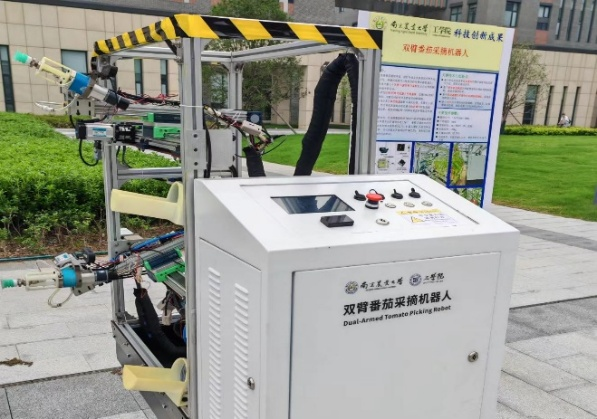 在成果展示区广场上,十余台农业机器人以“静态展板+动态样机”的形式同台亮相,吸引众多参会代表驻足交流。薛金林教授团队研发的果园智能采收机器人,搭载双机械臂系统与先进视觉识别算法,可在模拟果园场景中精准识别成熟果实,并自主完成抓取、搬运、存放全流程作业,识别准确率超过90%,能够高效实现梨、苹果、葡萄等水果的无损采摘。汪小旵教授团队推出的双臂番茄采摘机器人,以每分钟16—18个的采摘效率稳定运行,其创新设计的多层真空吸盘旋转末端执行器,可依据果实形态动态调节吸附曲面,有效解决了人工采摘“耗力且易损伤果实”的行业难题。