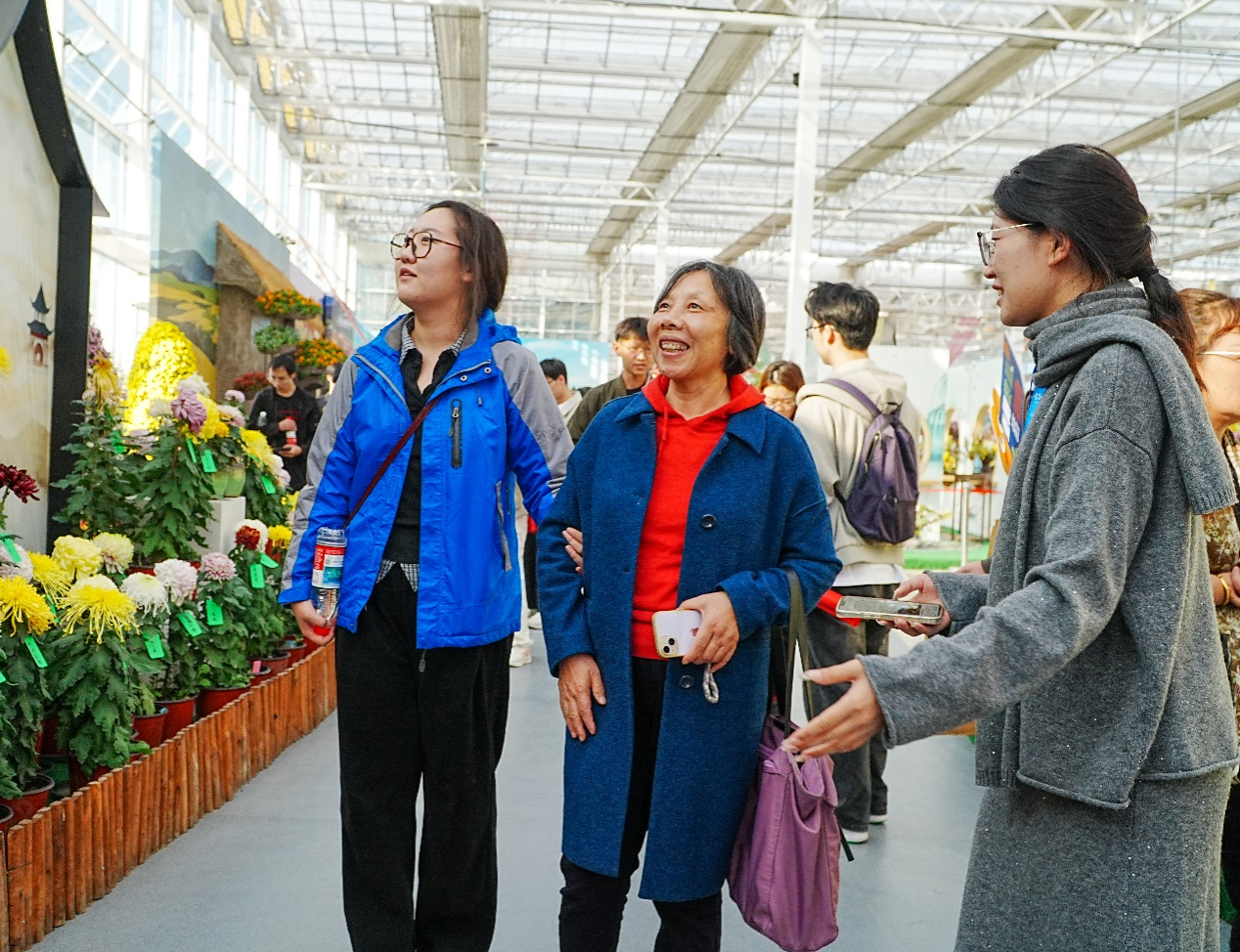 合影后,师生便带着这份联结漫步菊花园。金黄、淡紫等各色菊花竞相绽放,其“高洁坚韧”的文化寓意与老教师的讲述相互交织——老教师结合自身扎根农业工程领域的经历,将菊花象征的坚守品格与求学从教岁月相联结,从年轻时克服艰苦条件投身农机研发的初心,到如今退休后仍心系学科发展的牵挂,让青年学子既看见花色之美,更在讲解中读懂传统草木里的精神密码,触摸前辈矢志科研的奋斗初心。