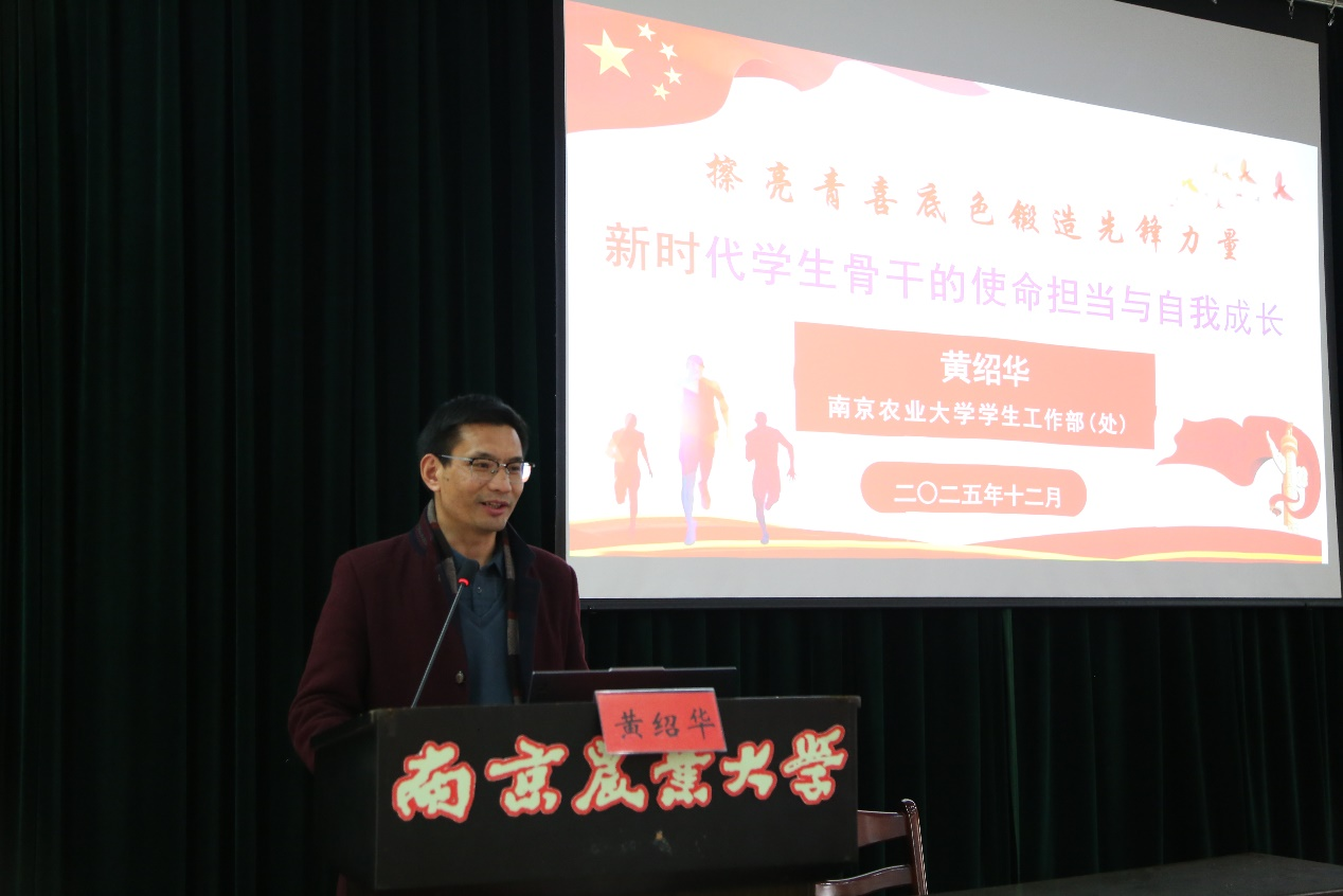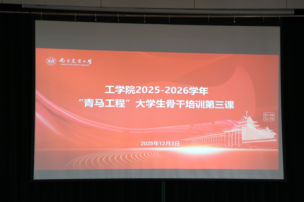 2025年12月2日下午,南京农业大学工学院团委在浦口校区图书馆报告厅成功举办2025-2026学年“青马工程”大学生骨干培训第三期——“擦亮青春底色,锻造先锋力量——新时代学生骨干的使命担当与自我成长”。本次培训旨在进一步强化学生干部的使命担当意识、提升综合能力素养,着力建设一支能力突出、素质过硬的学生骨干队伍。出席本次活动的有:南京农业大学学生工作部副部长、江苏省习近平新时代中国特色社会主义思想研究中心南京农业大学基地研究员、全球职业规划师黄绍华;工学院学生工作办公室副主任、团委副书记樵明玉;工学院专职辅导员徐功迅;工学院各学生组织骨干及大一各班级学生代表参与培训。