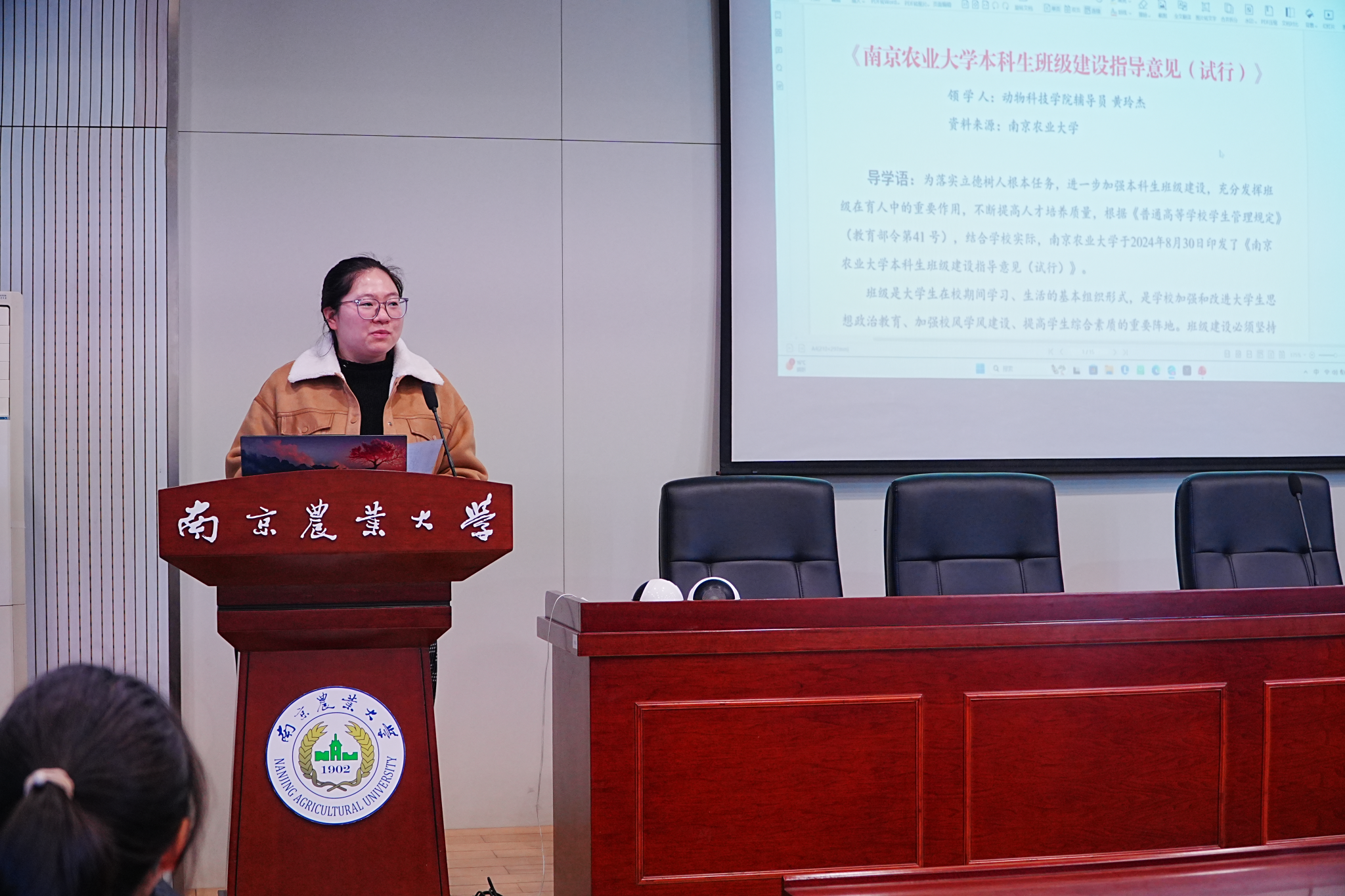 会议最后,辅导员樵明玉进行总结,并领学《南京农业大学班干部管理规定》重点内容。她结合条例精神,进一步明确了班团骨干的职责边界与工作规范,并就“如何常态化、精细化开展班团活动”与现场同学进行交流。樵明玉细致询问了各班目前在活动组织、同学参与、资源对接等方面的实际情况,听取大家的困难与建议,并鼓励骨干们学规定、懂业务、会落实,在日常工作中做到既有章可循,也有温度有力。
