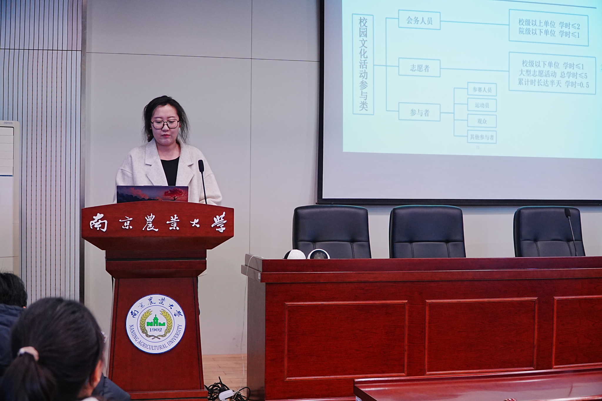 随后,辅导员康泽华就“第二课堂成绩单系统使用规范”进行培训。她介绍了系统操作的主要流程,包括活动发起、审核设置、签到管理和学时认定等环节的基本要求,重点说明了不同类型活动的学时认定标准及注意事项,提醒各班团骨干在组织活动时要确保信息准确、程序规范,避免常见错误导致审核不通过。