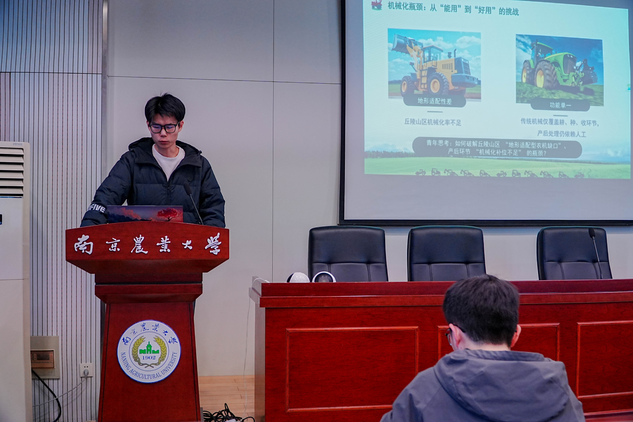 会议伊始,人工智能学院青年讲师团成员戴阳以“农业机械化到智能化的突破与展望”为主题进行分享。他系统梳理了从第一台国产履带式拖拉机“东方红-54”下线,到当前AI驱动下的无人农场、高精度导航与智能农机系统的发展历程,通过典型案例阐释了农业机械从“单一机械”到“智慧系统”的跨越,生动展现了技术革新为农业领域带来的深刻变革。