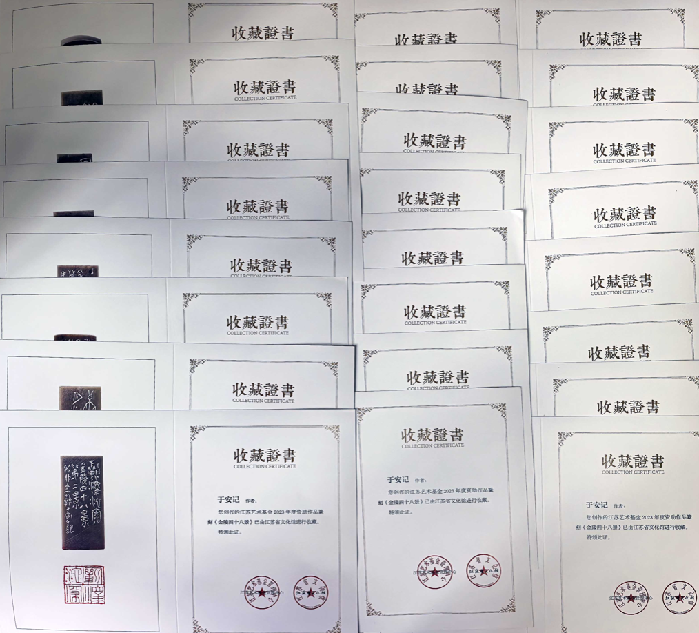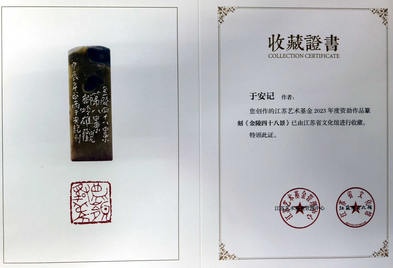 近日,我院于安记副教授的江苏艺术基金个人美术创作资助项目成果——《金陵四十八景》48方篆刻作品,被江苏省文化馆正式全额收藏。该作品不仅顺利通过专家评审完成项目验收与结项,更成为江苏艺术基金成立以来单次收藏规模较大的典型案例。