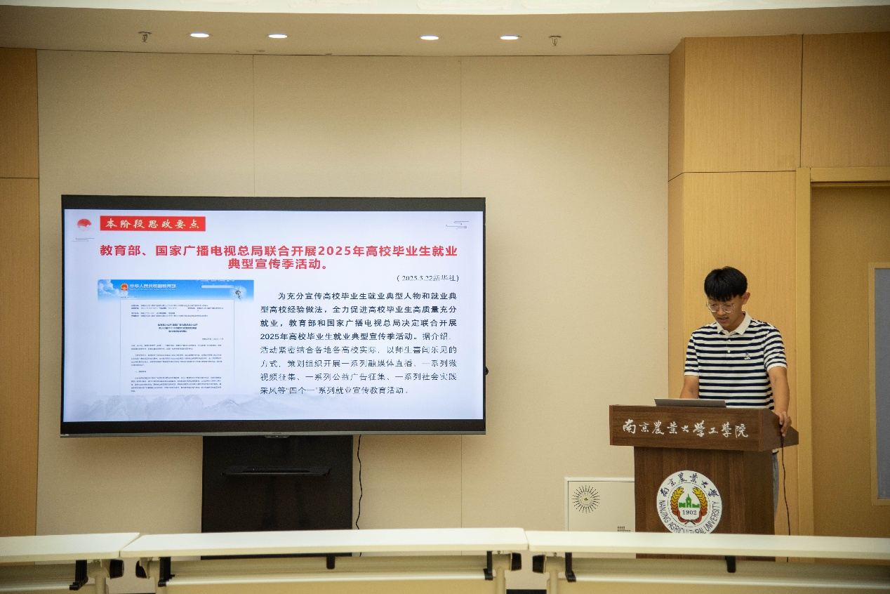 工学院辅导员徐功迅回顾了近两个月的重要时政信息与思政教育动态,包括国家促进高校就业政策、教育部最新文件学习、人工智能在教育方面的应用等,还为大家分享了国内多所兄弟高校在党建思政、学风建设、心理健康等方面最新的学生工作动态。
