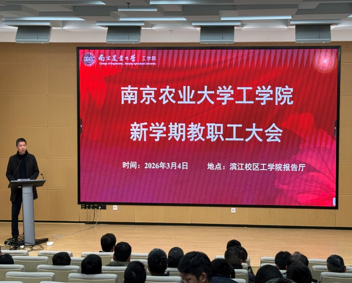 为全面部署新学期工作,凝聚全院力量共谋发展,2026年3月4日下午,南京农业大学工学院在滨江校区12号工学楼A108报告厅隆重召开新学期全体教职工大会。学院领导班子成员及全体教职工参加会议,大会由院党委副书记刘平主持。