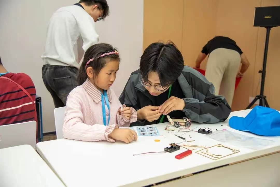 实践制作环节,入党积极分子与孩子们分组协作,共同完成小车拼装。大家在动手实践中感受创造的乐趣,于协作交流中相互学习、共同进步。